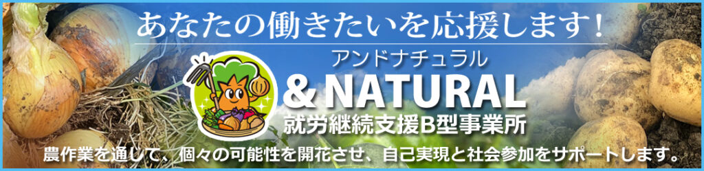 “&NATURAL”は2023年7月1日より開設した就労継続支援B型事業所で、農業と福祉で連携したプログラムを提供しています。農薬・化学肥料・除草剤不使用の安心な野菜を作り続け、持続化できる農業を行うために、野菜及び加工品作りを行っています。 マイペースに取り組みたい︕だれともあまり話さずに行いたい︕少しだけ土に触れたい︕ 野菜を育ててみたい︕喜ばれたい︕気軽に行きたい︕など、目的に応じてあなたの能力や意欲を最大限に引き出し、自己実現の手助けをします。 自然との触れ合うことで、仕事への責任感、生活のリズム形成など、様々な効果や成果を得ることができます。農作業の魅力を最大限に生かし、成功体験を積むきっかけの場を目指します。