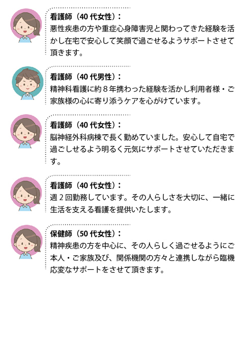 その人がどんな時もその人らしくあるために、その人らしさにこだわり、その人の人生の伴走者となり支えていく看護を目指しています。