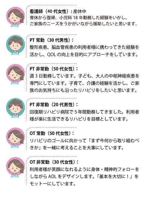 月に2回、ステーション内でミーティングや勉強会を行い、情報の共有と1人ひとりのスタッフの専門性や強み、また考えや思いを大切にします。
